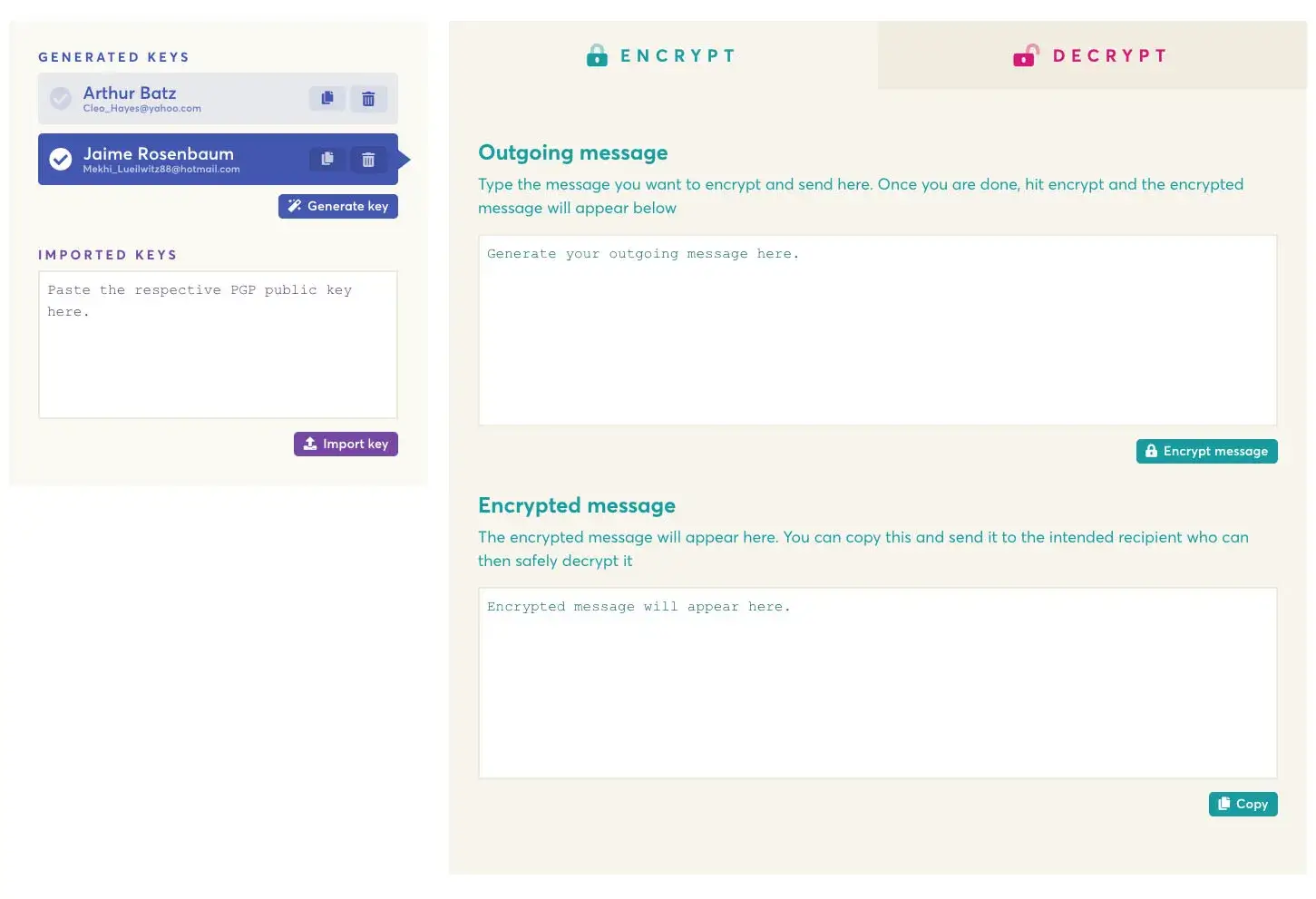 EncryptEasy - это простой и простой в использовании PGP инструмент шифрования, управления вашими ключами и ключами ваших контактов. Шифрование не должно быть сложным процессом для пользователя. Разработано на Wails.